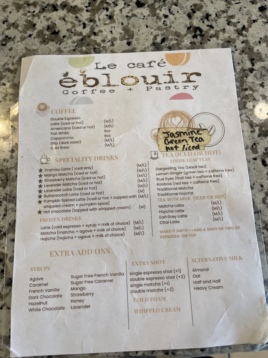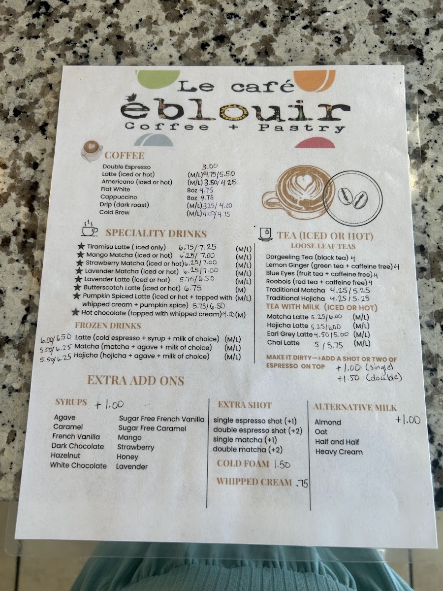 From a reviewer’s perspective, the menu at Le Cafe Eblouir offers a thoughtfully curated selection that balances familiarity with creativity, leaving a polished final impression of the café’s identity. The coffee lineup highlights well-loved classics such as Double Espresso, Latte, Americano, Flat White, and Cappuccino, all of which can be customized with flavorful syrups like Agave, Caramel, French Vanilla, Dark Chocolate, and Hazelnut, allowing guests to tailor each cup to their preference. What truly elevates the menu, however, is the range of specialty drinks. Signature options like Tiramisu Latte, Mango Matcha, Strawberry Matcha, Lavender Matcha, and Lavender Latte showcase a creative fusion of dessert-inspired and floral notes, making them memorable choices for those seeking something beyond traditional coffee.